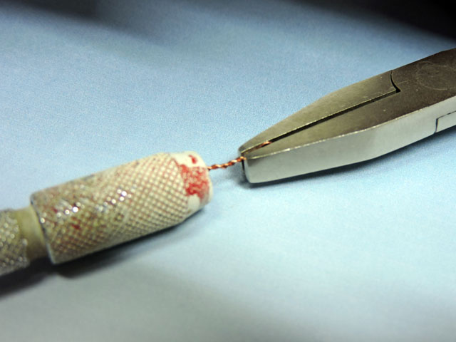 On a besoin d’un vieux pinceau, du fil de fer (1, 0.9 ou 0.6 mm), un peu de Milliput, une perceuse à main et une paire de pinces.