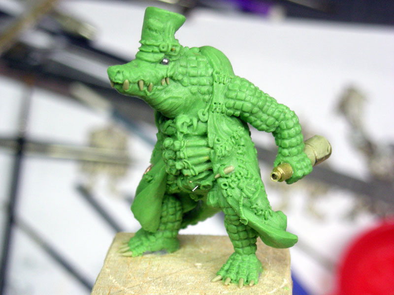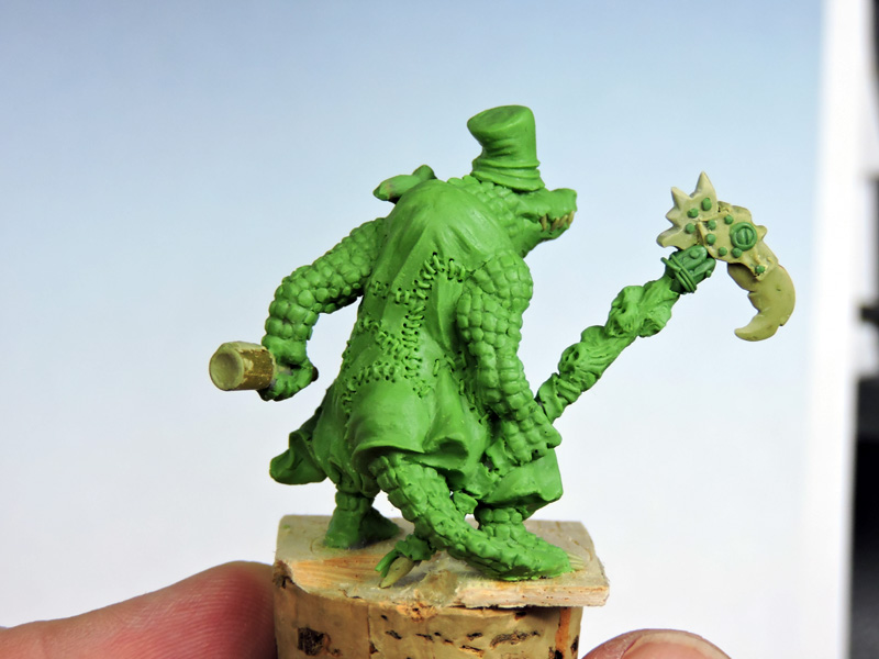 The rivets and the small details are made with greenstuff. The skulls on the staff are made with sculpey.