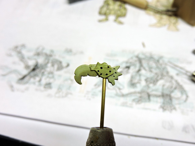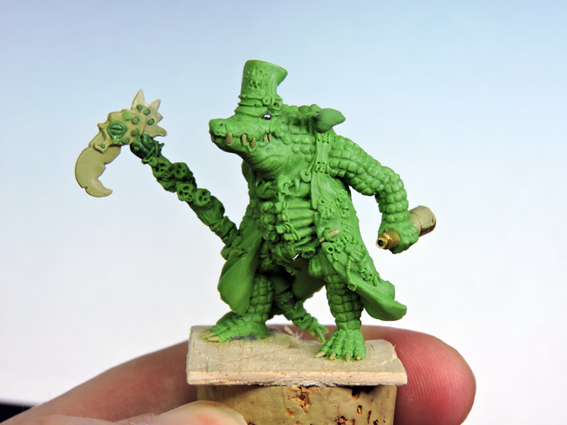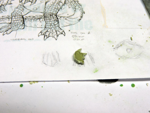 The rivets and the small details are made with greenstuff. The skulls on the staff are made with sculpey.