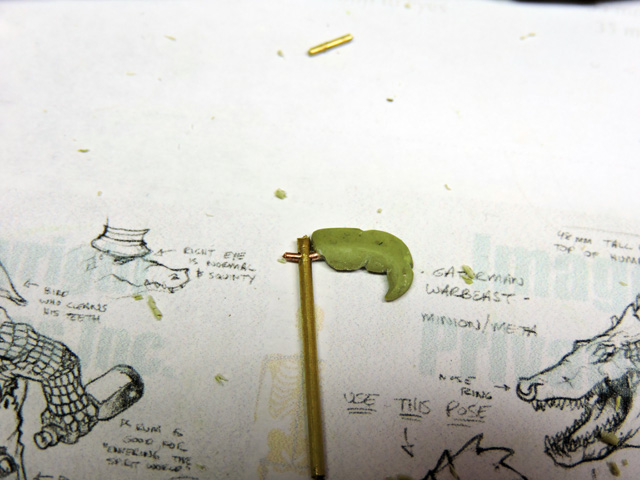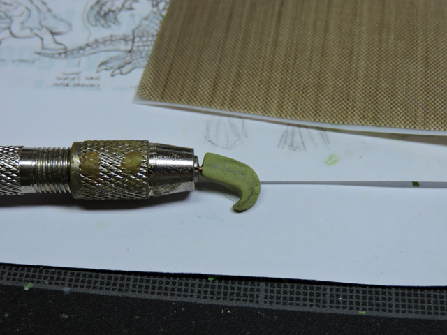 On crée tout d’abord une feuille de milliput de la forme approximative de la lame avec un fil de fer à l’intérieur.