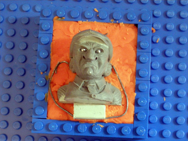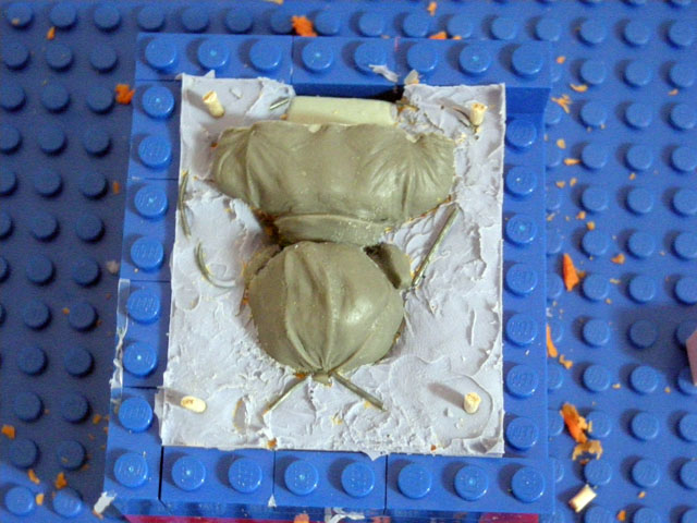 Now you put your master on his lego and plasticine bed, you press it slightly and firmly. Add some plasticine if necessary at some places where you think you can have “mold lock” i.e. impossibility to detach the mold from the original sculpture like in this example if I had the front and the back of the ear in the same part of the mold. You make some tubes to make the circulation of the resin easier (I used wires to do so). Don’t forget to make some keys like I did, I had to put some some small wooden sticks in the first part of my mold before doing the second part. Usually, you just have to make some plasticine balls around your master.